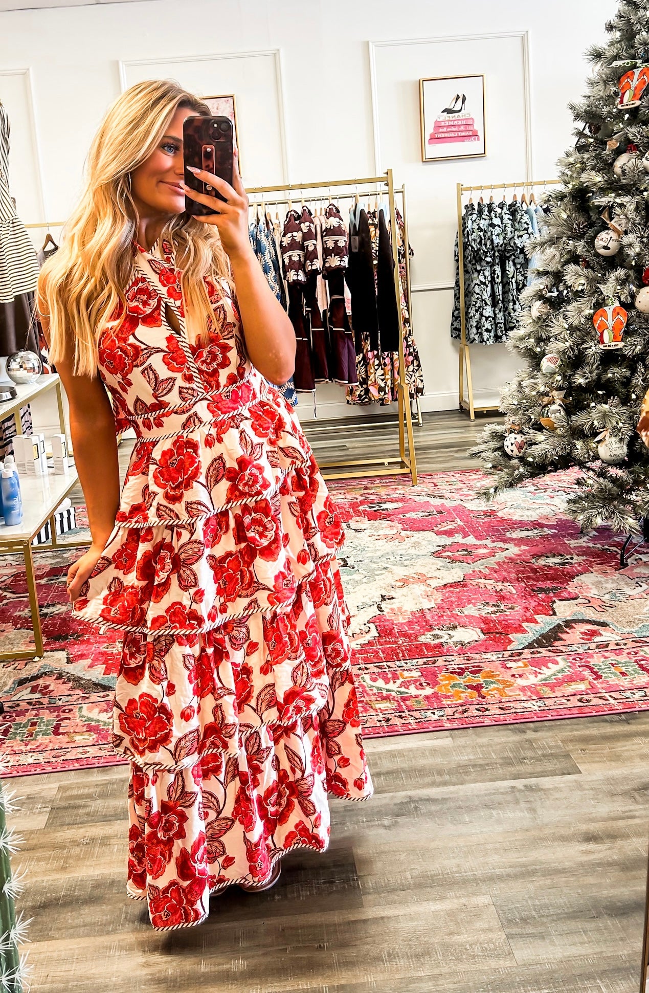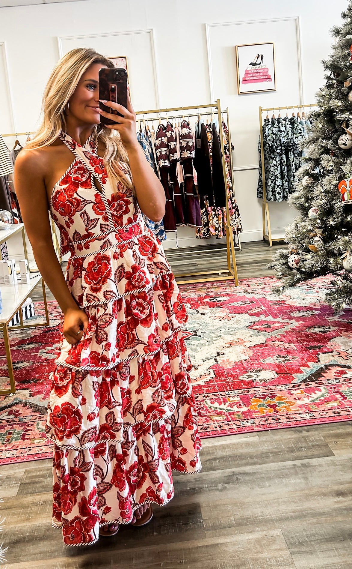 Floral tiered maxi with halter or criss cross neckline. Adjustable tie back. Fits true to size!