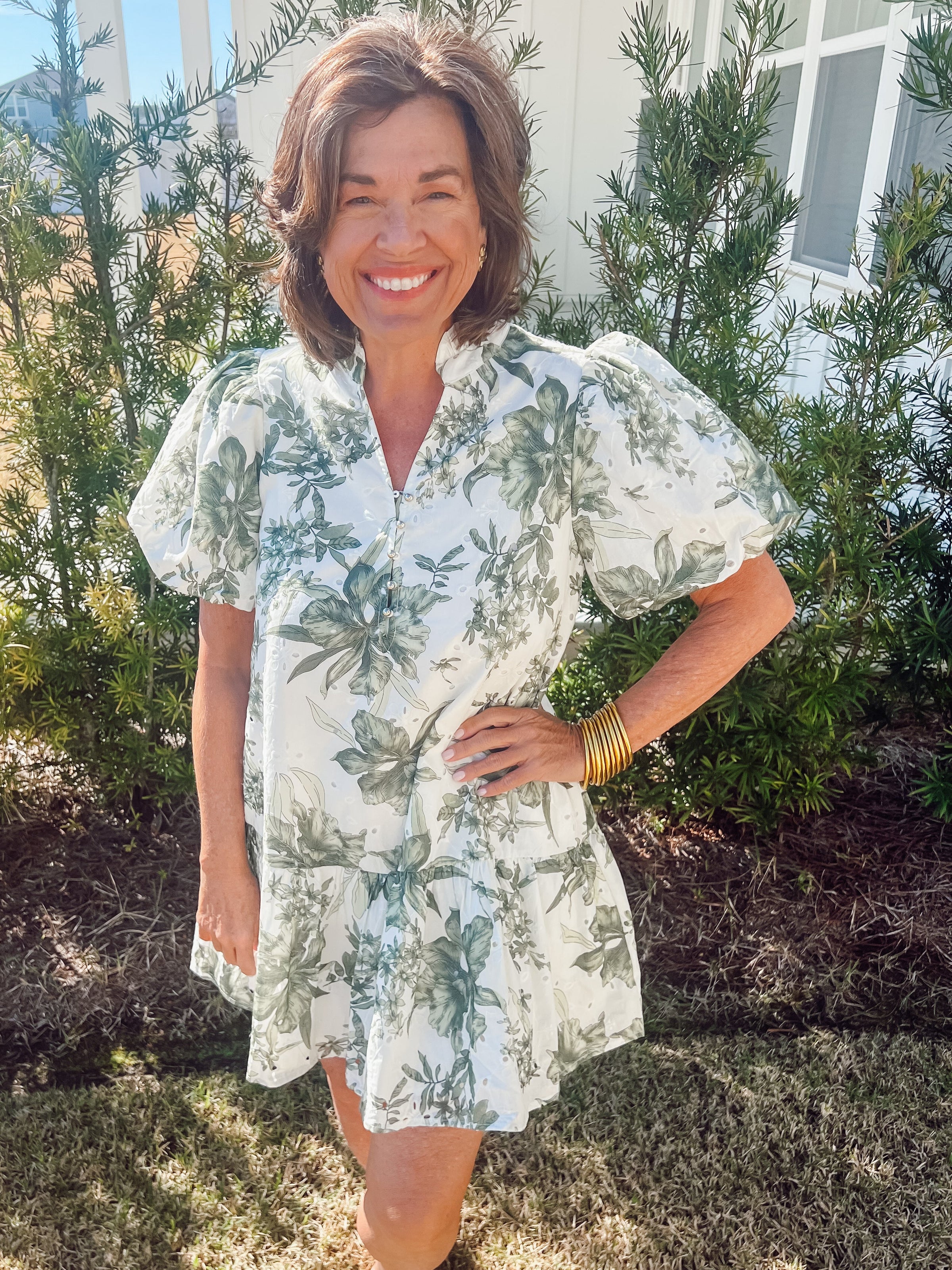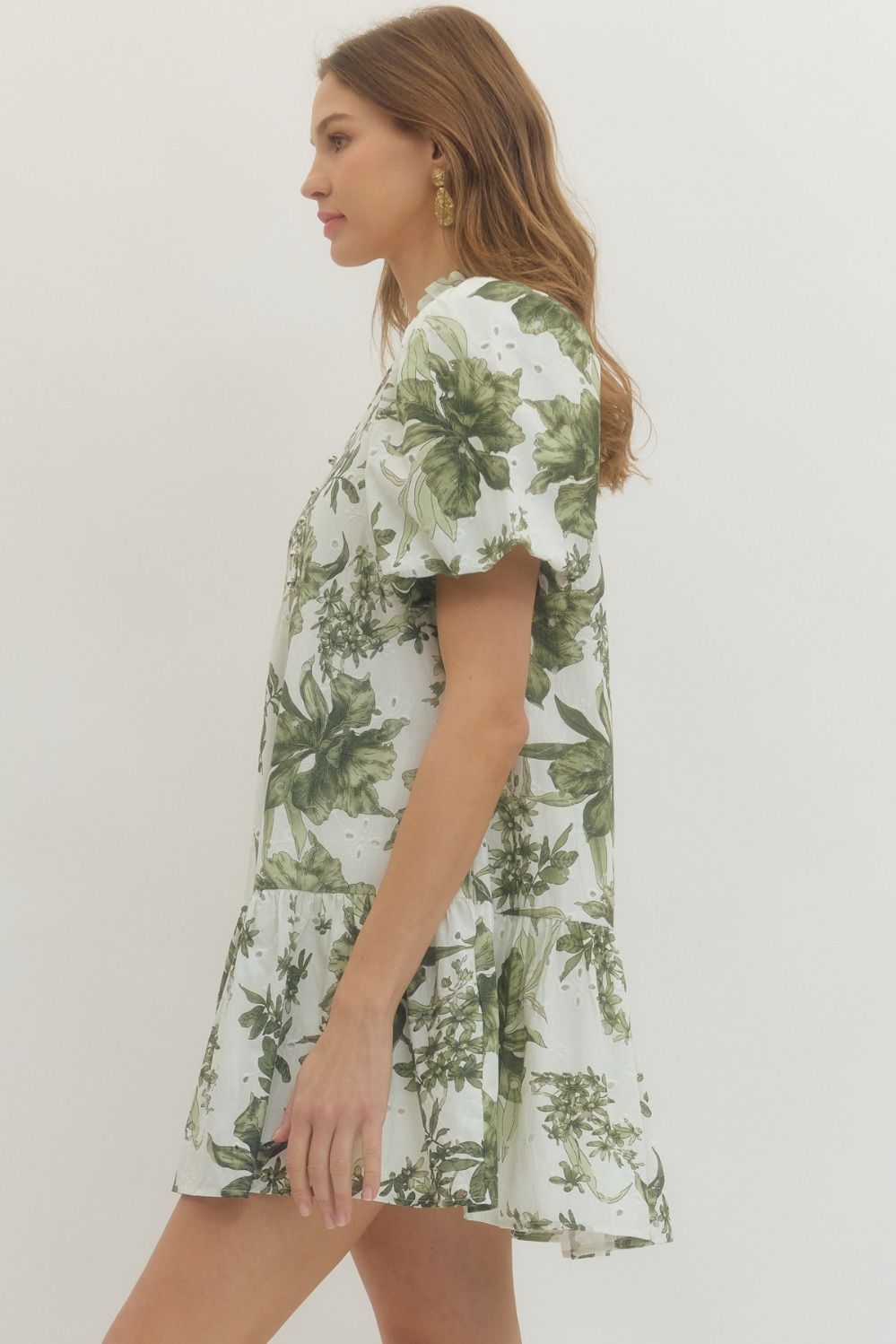 Botanical print short puff sleeve mini dress featuring band collar split V-neck and button closure at front with ruffle hem. Side pockets. Lined. Woven. Non-sheer. Lightweight.