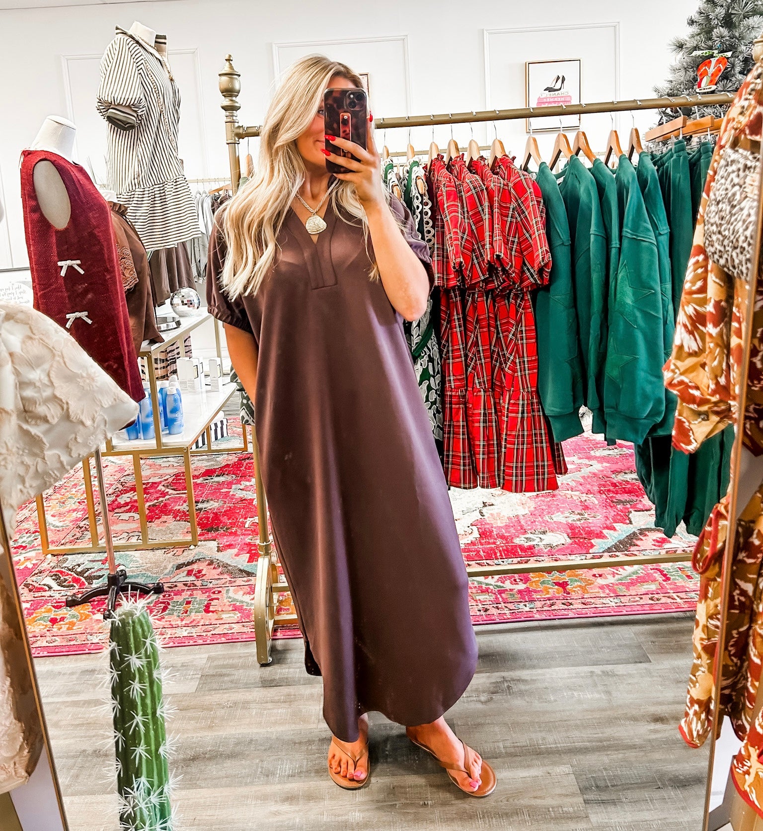Chocolate brown midi dress with side slit detail. V neck and batwing sleeves. Material is a breathable scuba like feel. Fits true to size, if in between can size down!