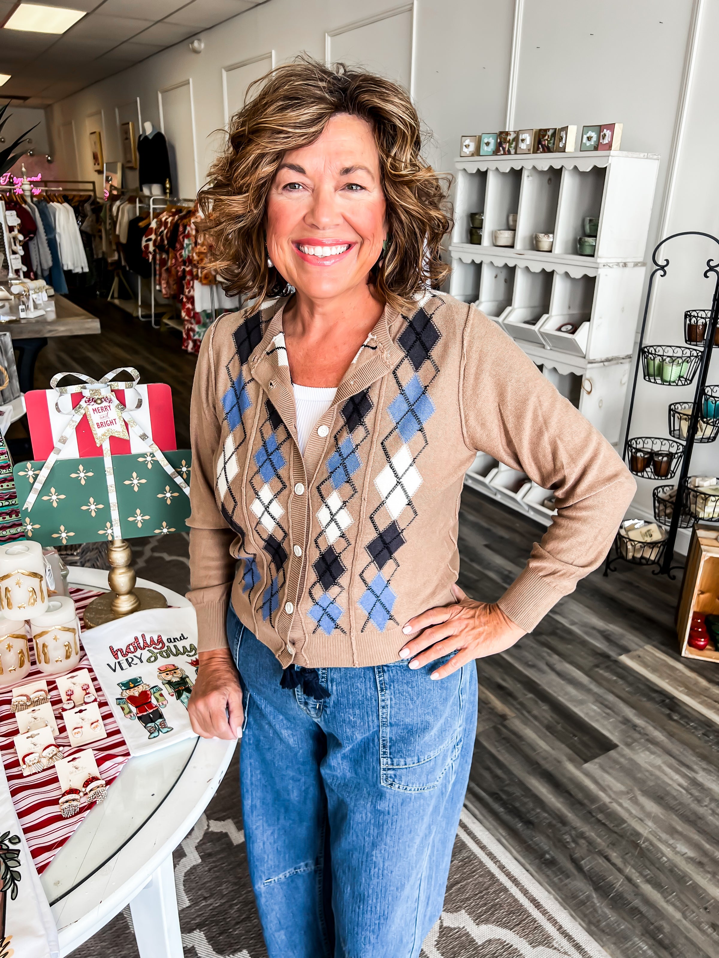 Features a cozy, relaxed silhouette with a modern take on the classic argyle pattern. Kitted from a soft touch yarn, ribbed cuffs and button down closure.