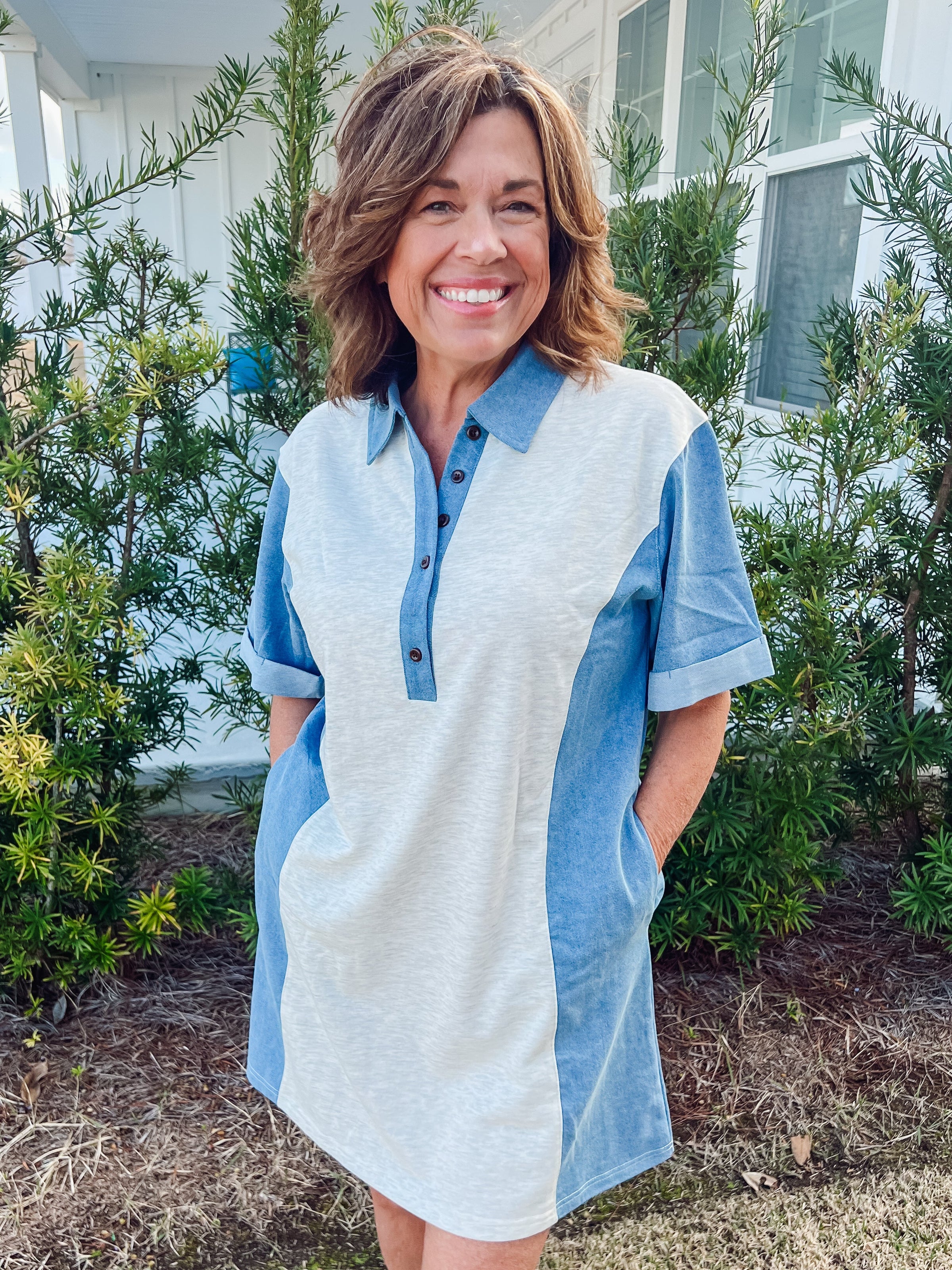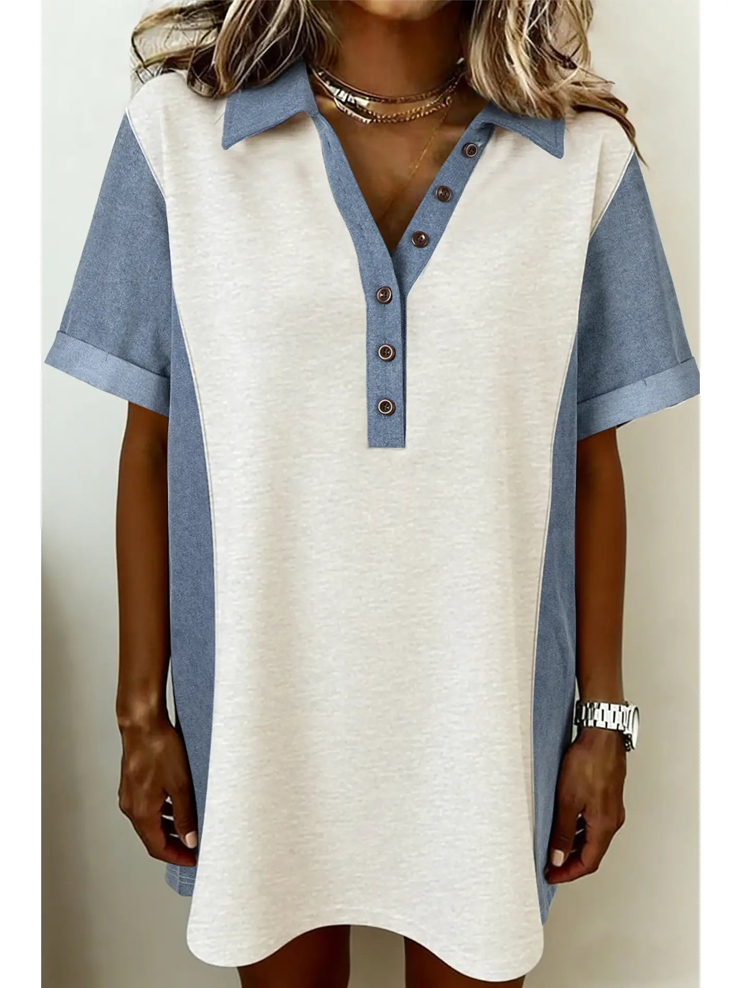 Denim color-block + patchwork for modern casual cool with a relaxed t-shirt silhouette fit.