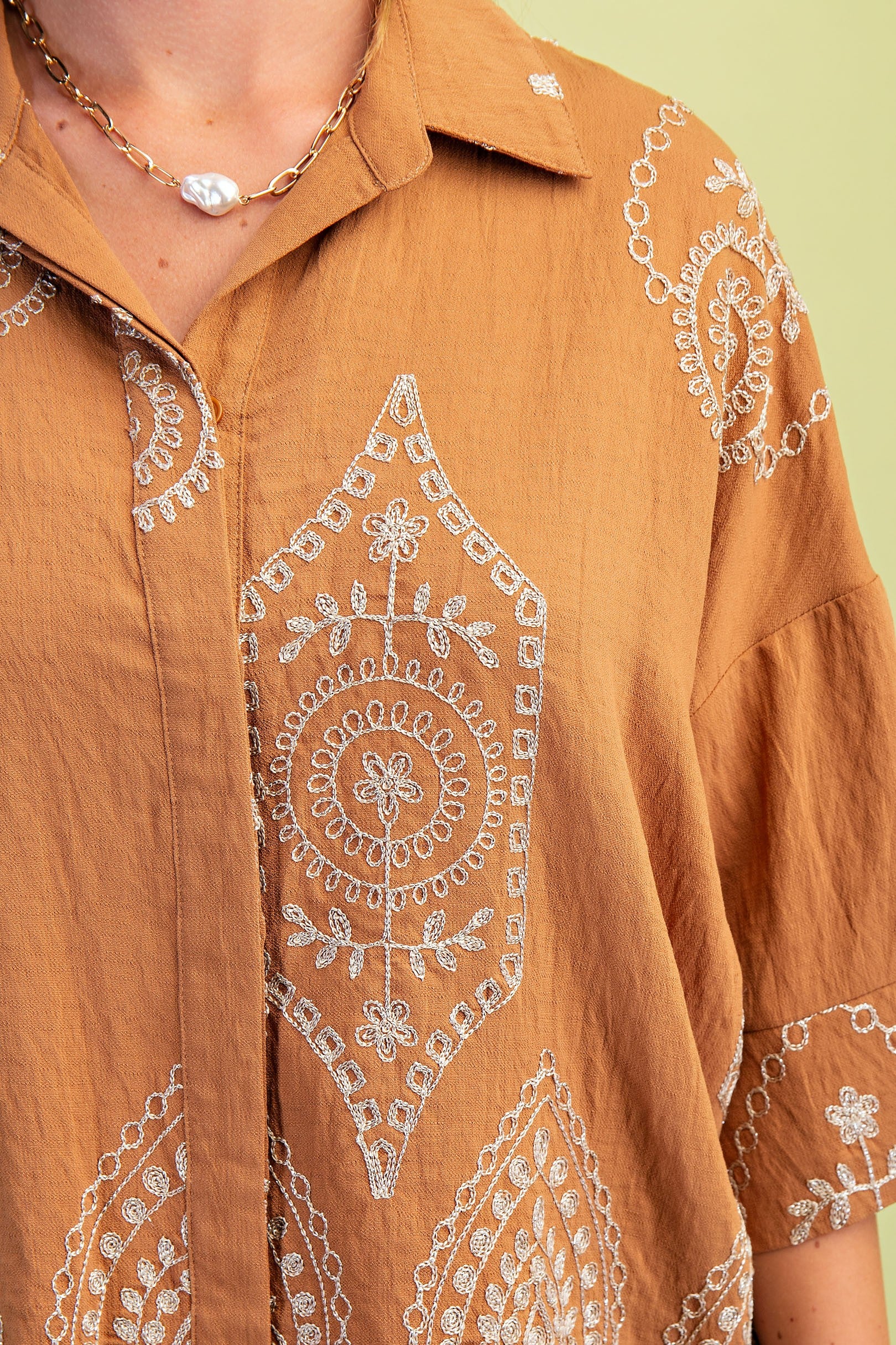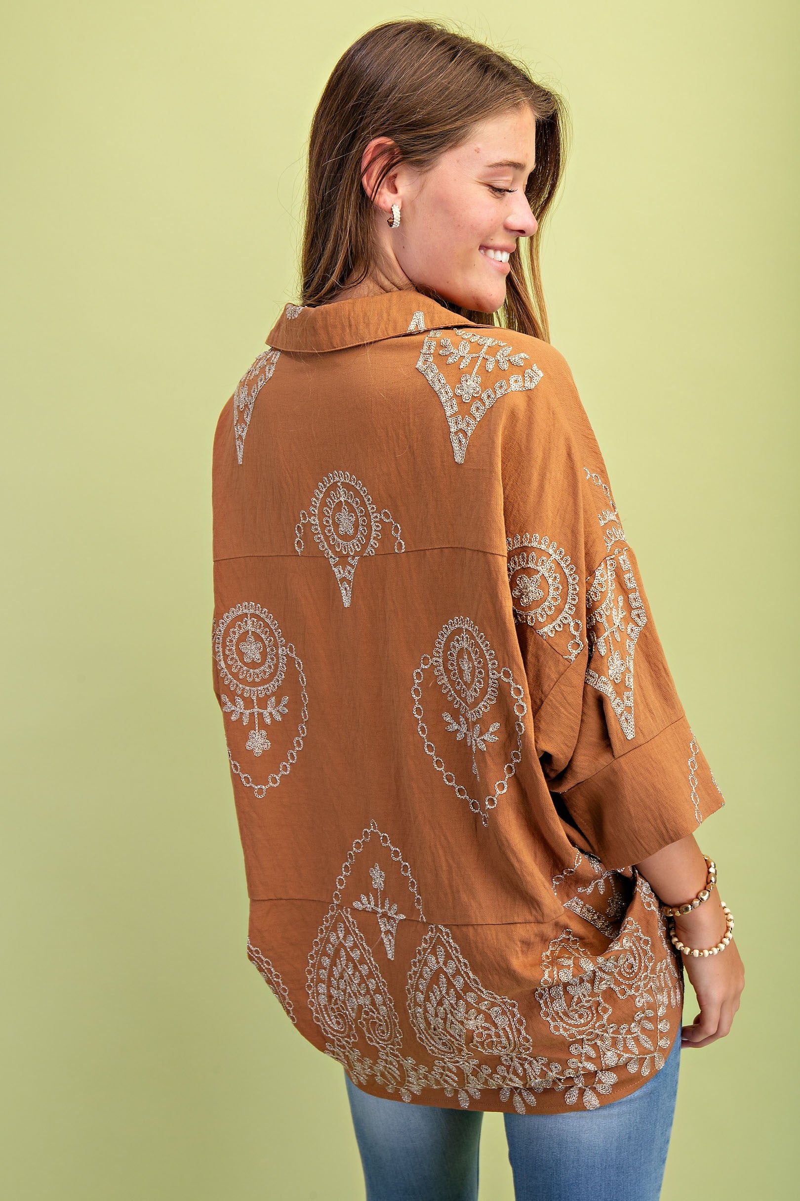 3/4 length sleeve button down top with metallic embroidery details! Fits true to size!